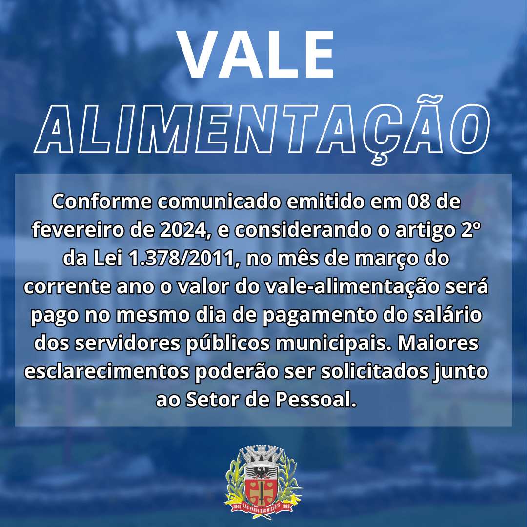 Conforme comunicado emitido em 08 de fevereiro de 2024, e considerando o artigo 2º da Lei 1.378/2011, no mês de março do corrente ano o valor do vale-alimentação será pago no mesmo dia de pagamento do salário dos servidores públicos municipais. Maiores esclarecimentos poderão ser solicitados junto ao Setor de Pessoal.