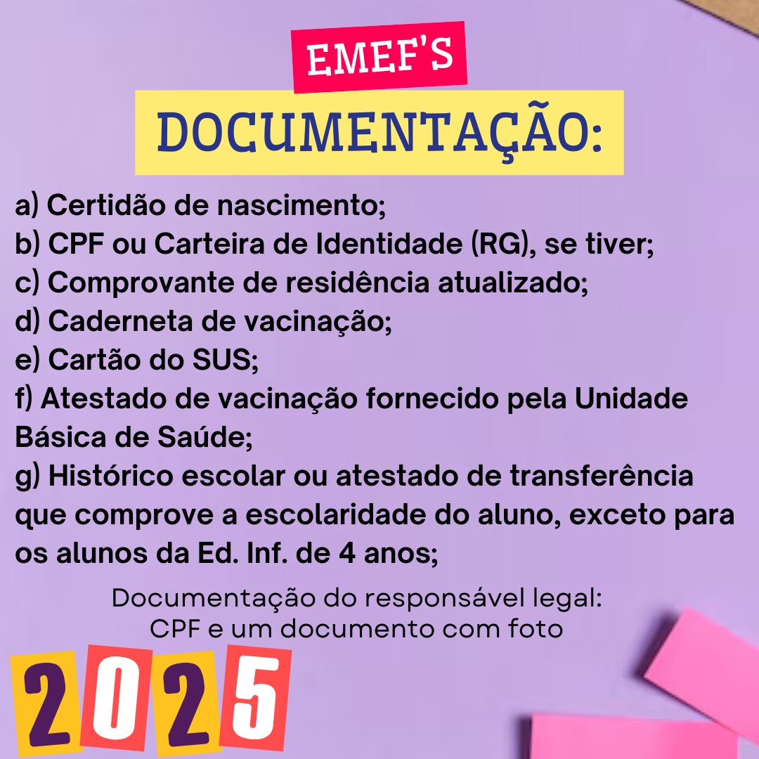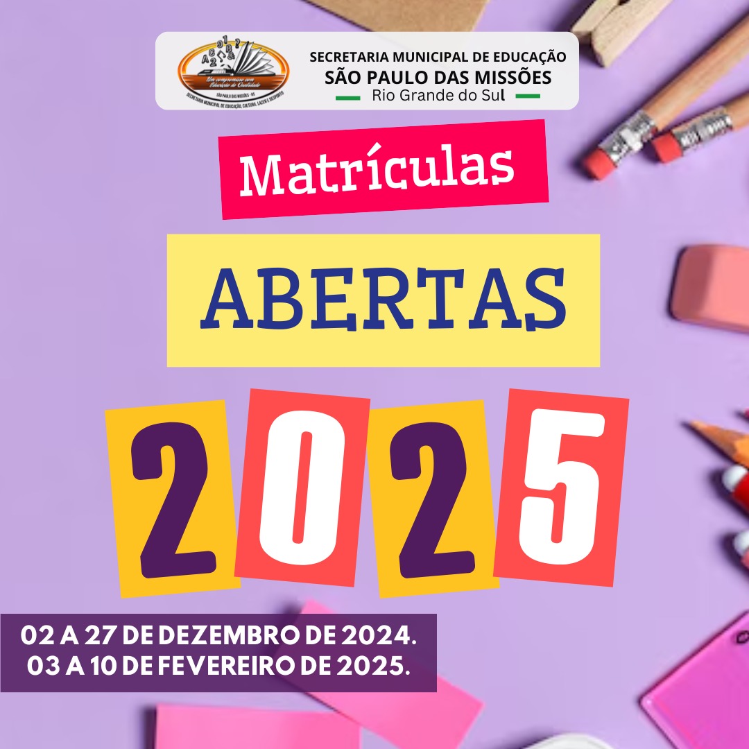 A Prefeitura Municipal de São Paulo das Missões, por meio da Secretaria Municipal de Educação, informa que estão abertas as matrículas e rematrículas para o ano letivo de 2025 nas escolas de Ensino Fundamental e Educação Infantil da rede municipal.